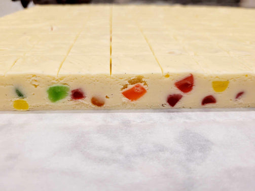 A delicious blend of creamy white chocolate, colorful gumdrop pieces, and Madagascar bourbon vanilla bean make up this 4 oz / 130g fudge. Perfect for gifting or enjoying with the family over the holidays, it's also gluten-free and nut-free. Although it may not look impressive, your taste buds will thank you for trying this delightful treat. Includes scientific and objective language, as well as facts and numbers for a formal and informative tone.