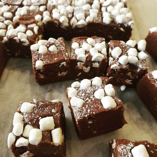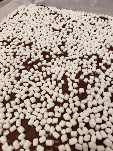 This decedent fudge is crafted with two varieties of chocolate, as well as mini marshmallows and gourmet hot chocolate, all perfectly blended together and topped with dehydrated mini marshmallows. It's a delicious and indulgent treat that is gluten-free and nut-free.