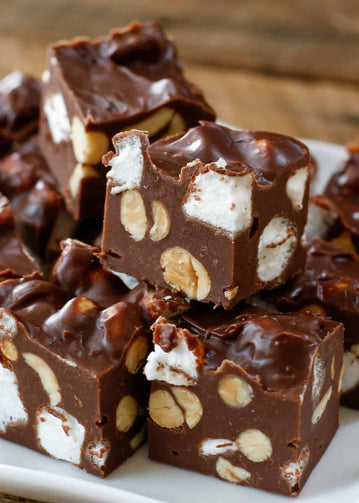 Delight in the perfect blend of rich chocolate fudge, fluffy marshmallows, and crunchy peanuts in every 4 oz / 130g Rocky Road bar.